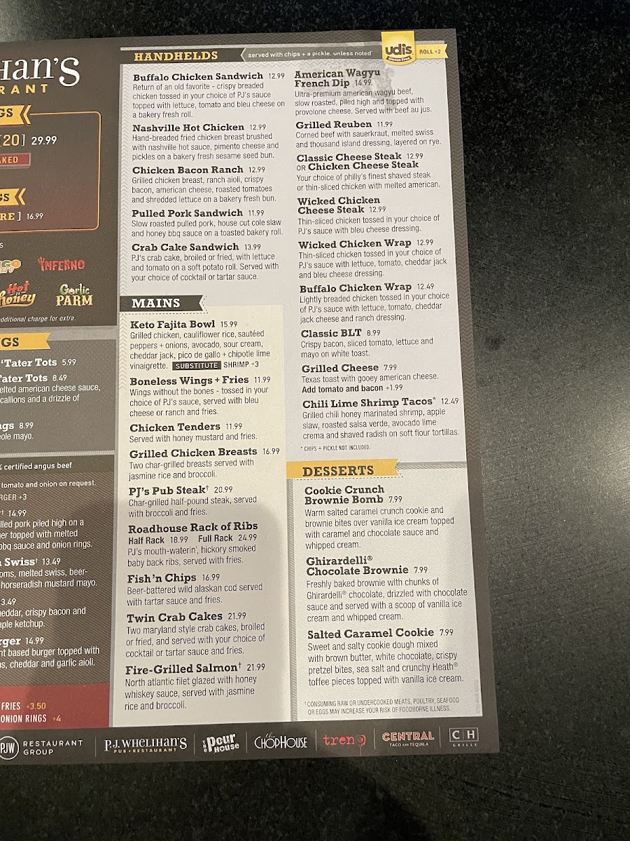 For burger enthusiasts, options range from the classic cheeseburger to the indulgent PJ’s Burger with crispy bacon and caramelized onions. Mains like the Keto Fajita Bowl and Boneless Wing Platter are sure to please, serving up delicious flavors and generous portions. The friendly ambiance is complemented by attentive service, creating an inviting space for gatherings or game days. Whether you’re a sports fanatic or a culinary adventurer, P.J. Whelihan's is your go-to spot for delightful food and memorable experiences.